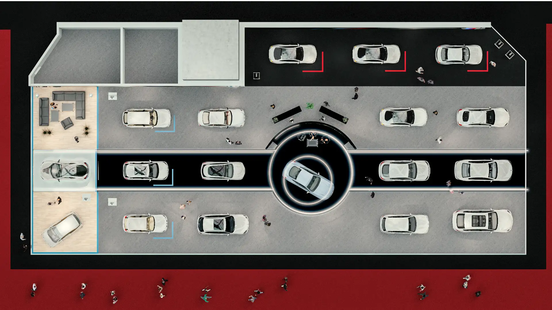Grundriss des Messestandes von BMW auf der Vienna Autoshow 2019 mit mehreren Autos, die in Reihen ausgestellt sind. Menschen gehen herum. Auf einer zentralen kreisförmigen Plattform ist ein BMW 8er platziert. Lounge-Bereiche sind auf der linken Seite. Ein roter Teppich mit Besuchern ist im unteren Bereich zu sehen.
