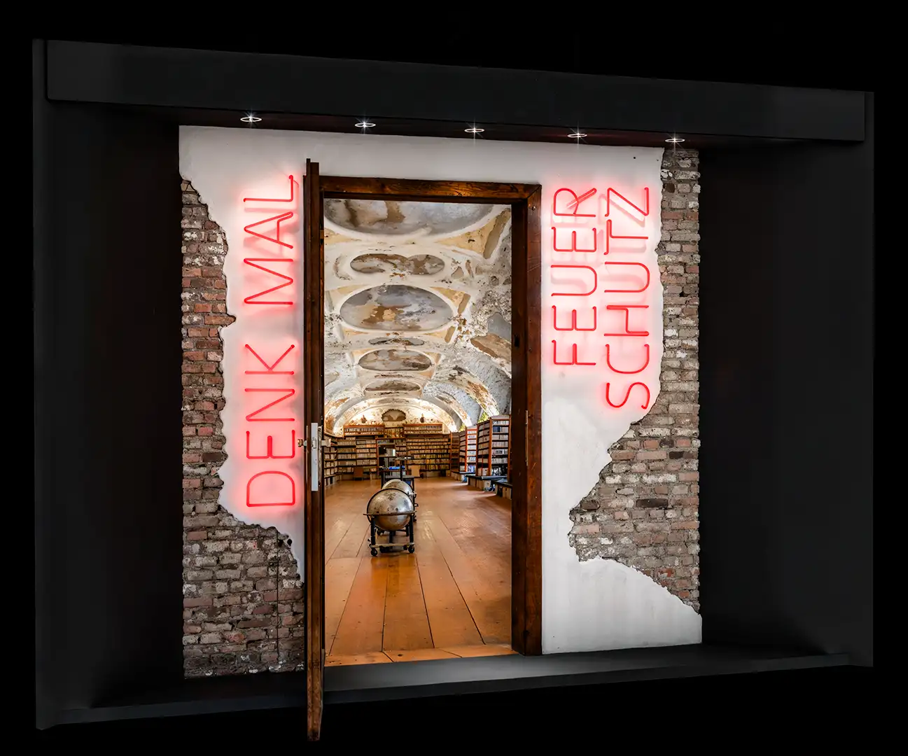 Messe Display von Feuerschutz team im einer Tür aus Holz in einem alten Mauerwerk aus Ziegeln. Die Tür ist offen und zeigt in eine alte Bibliothek. Lins und rechts der Tür ist eine Schrift aus roten Neonröhren "Denk mal" und "Feuer Schutz".