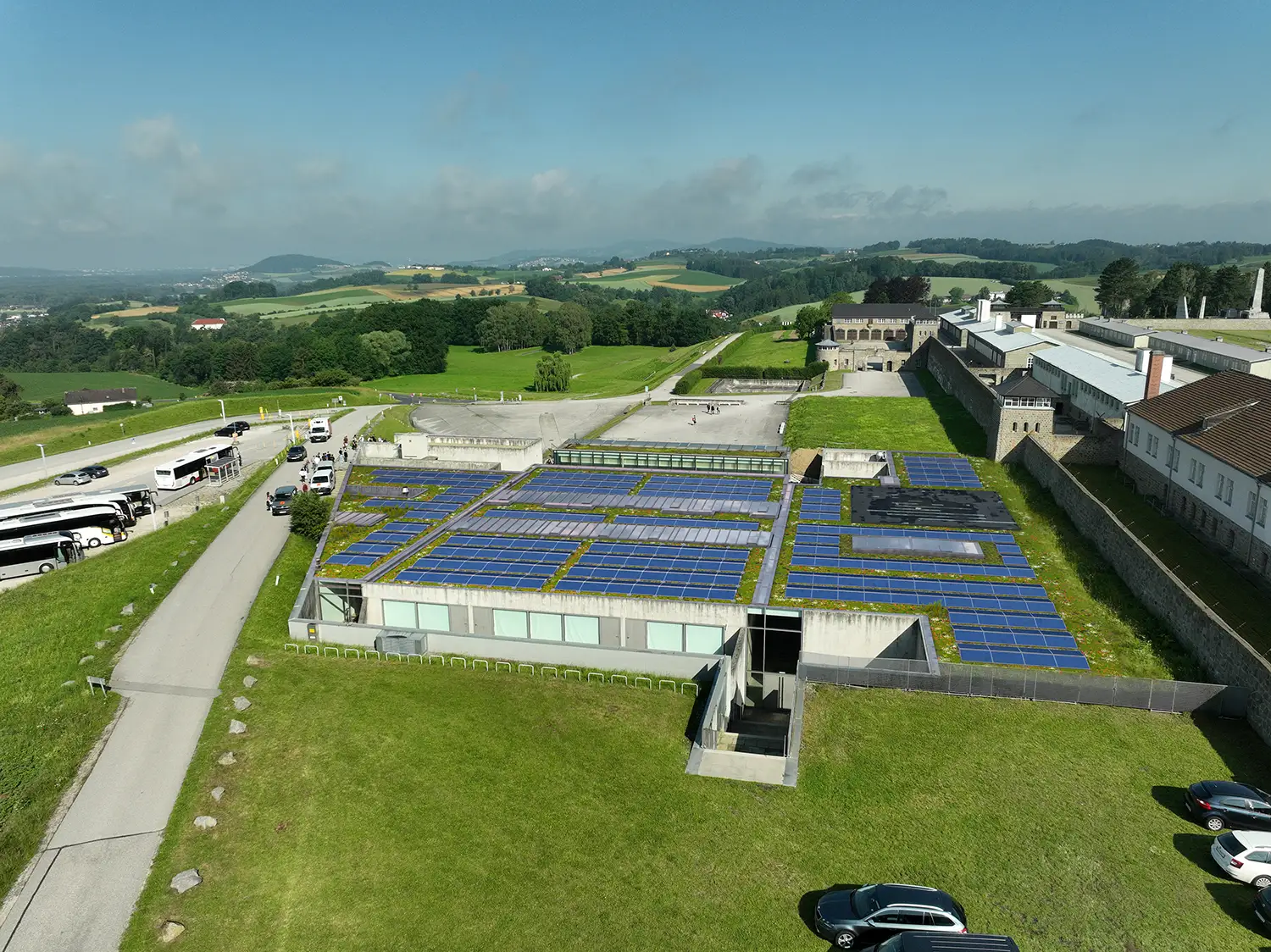 Photovoltaik Anlage auf einem flachen Gebäude, Besucherzentrum in der Gedenkstätte Mauthausen, umgeben von Grasflächen, Vogelperspektive mit Hügellandschaft im Hinergrund