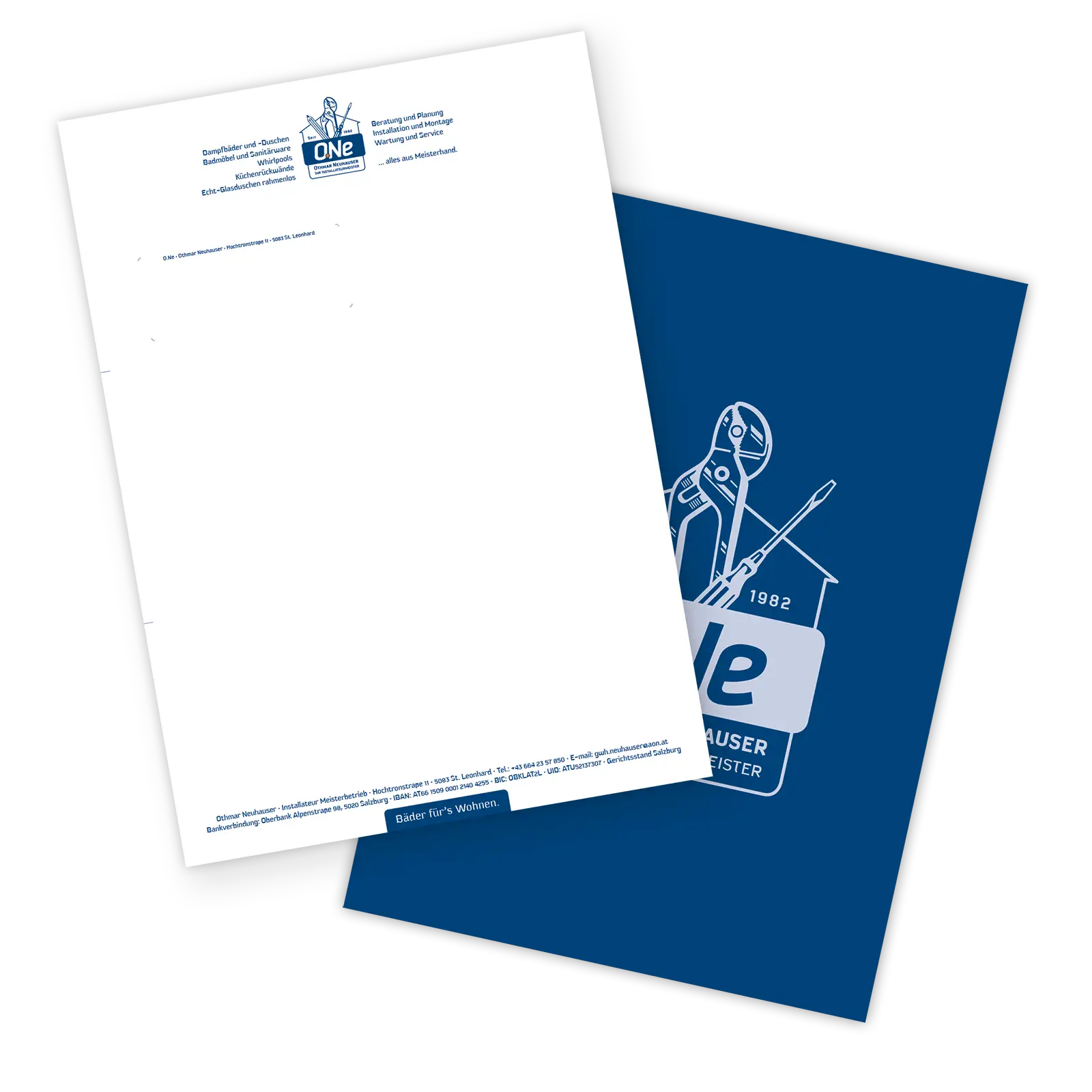 Briefpapier Istallateur Othmar Neuhauser. Vorderseite: Am oberen Rand ist das Angebot, das Logo, am unteren Rand die Adresse, Telefonnumer von Othmar Neuhauser. Am unteren Rand steht der Claim "Bäder für's Wohnen". Auf der Rücksteite ist das Logo auf einem in Weiß auf einem blauen Hintergrund.